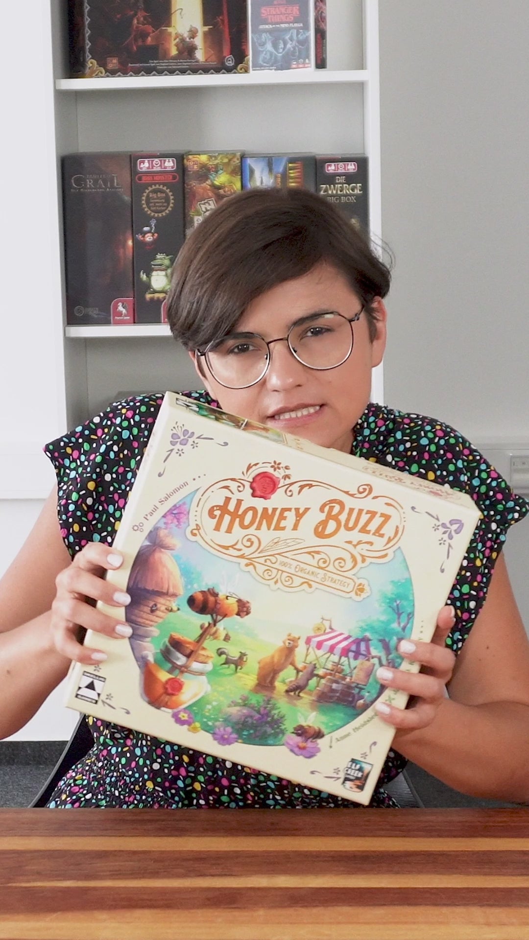 Honey Buzz ist ein Workerplacement, bei dem die Spieler ihren persönlichen Bienenstock ausbauen. Dazu ziehen sie verschiedene Wabenplättchen, die Aktionen ermöglichen, die im Laufe des Spiels ausgelöst werden. Jedes Plättchen steht für eine andere Aktion. Immer wenn ein Plättchen so gelegt wird, dass es ein bestimmtes Muster vervollständigt, wird eine Reihe von Aktionen ausgelöst, und zwar in der Reihenfolge, die der Spieler wählt. Ein Plättchen, das in der ersten Runde gezogen wird, kann bis zu drei Mal im Laufe des Spiels ausgelöst werden. Alles hängt davon ab, wie der Spieler seine Bienen platziert und seinen Bienenstock aufbaut. Denn im Honiggeschäft sind effiziente Prozesse das A und O.
